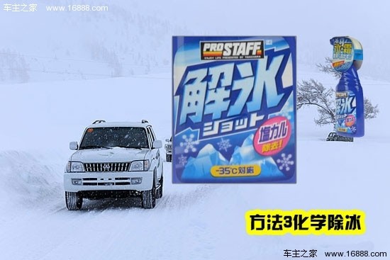 目前市场上有一种喷雾除冰雪剂,它是专为结冰的车窗和雨刮器解冻的高速防冰喷洒浓缩液,不损伤车身表面,可防止再次结冰和弄脏。在零下30℃以下的低温时,可轻易地除去冰雪,同时,它还能防止挡风玻璃和积水部位结冰,不损伤车身表面,清理后玻璃光洁,不留条痕。