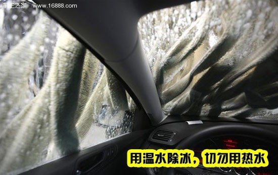 冬季车窗结冰,切记不要用热水化冰,虽然热水比温水化冰速度快很多,但危险性很高,很容易让挡风玻璃爆裂,毕竟温差太大。用冷水也有损车漆,而且之后结霜可能更严重。当前挡风玻璃的结冰不是很厚时,可以用抹布在40--50度的温水里涮几遍,然后轻轻擦一擦挡风玻璃,擦几遍后再用40度左右的温水冲一冲,一般就能冲干净。如果挡风玻璃结冰比较厚,在用温水化冰的同时,要开启车辆,车水温指针到了中间(大约水温到了七八十度)后,把暖风扭到向挡风玻璃吹,开最大挡,过一会儿玻璃热起来,结冰很容易化开了。