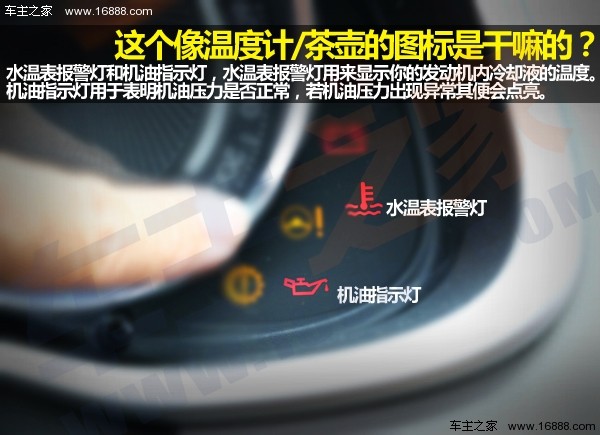 这两个图标也是非常形象,但是很多司机还是会将两个所表示的意思搞错搞错,两个灯在正常情况下车辆自检之后就会熄灭。图标像温度计的是水温表报警灯,用来表示冷却液温度,如果车辆冷却液温度过高或过低其将会点亮。图标像茶壶的是机油指示灯,用于表明车辆的机油压力是否正常值,如果出现异常指示灯就会点亮,如果行车中指示灯常亮时,则是有可能机油亏了,我们可以自己检查机油的液面高度,必要时候还是要到4S店做检查。
