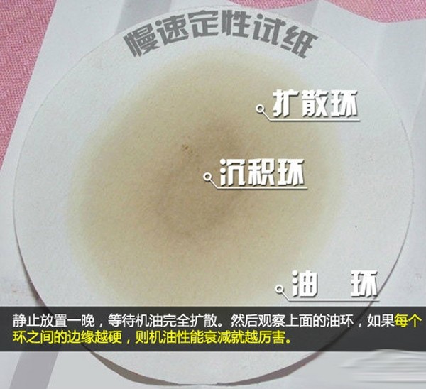通过机油尺中取出少量机油滴在机油试纸上,然后静止放置一个晚上,等待上面的机油在试纸上完全扩散。如果扩散的机油油环、沉淀环、扩散环之间的边缘越硬,则机油性能衰减就越厉害。我们曾经有同事写过一篇文章,有兴趣的朋友可以点击阅读:《1毛钱测试机油质量》。