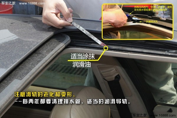 天窗使用久了,在其滑轨、缝隙中一般会有不少砂粒沉积,如不定期清理,则会磨损天窗部件。