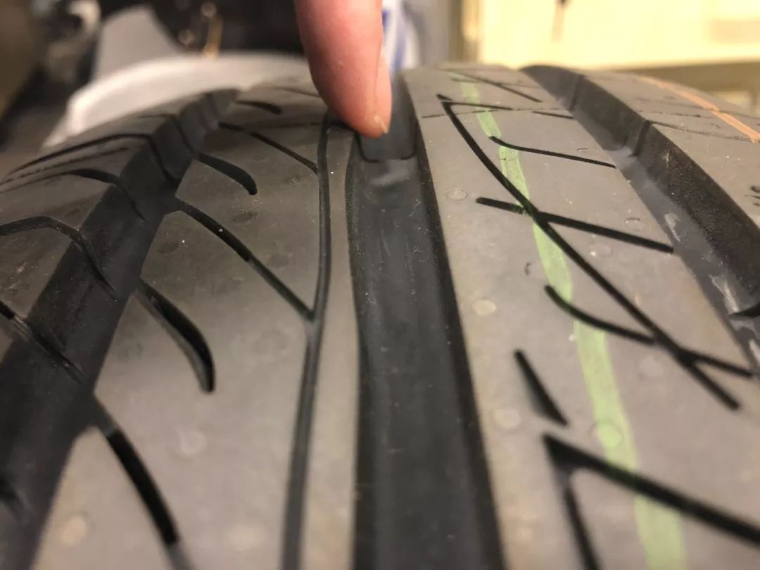 这个凸起的小疙瘩,就是磨损极限标志的位置了,你可以理解为,轮胎磨损到这个小疙瘩都可以触碰到地面了,说明你轮胎可以换了,当真的到这个时候,千万别犹豫,立马换多一刻跑在路面上都是危险的。