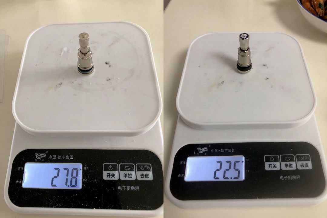 我们用现场照片来说事儿:其中一款气门嘴屁股底下的小孔直径很小,另一款则是一个大洞。拿在手里一个重一个轻。于是大虎悠找来了老婆做西点烘焙的精密秤,测量了不同气门嘴的重量之后,大家自己看照片吧!