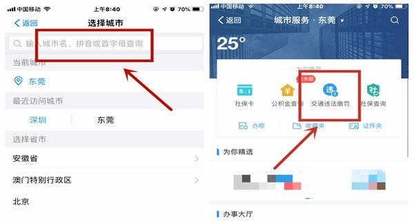 2、定位所在城市,成功后点击“交通违法缴罚”。