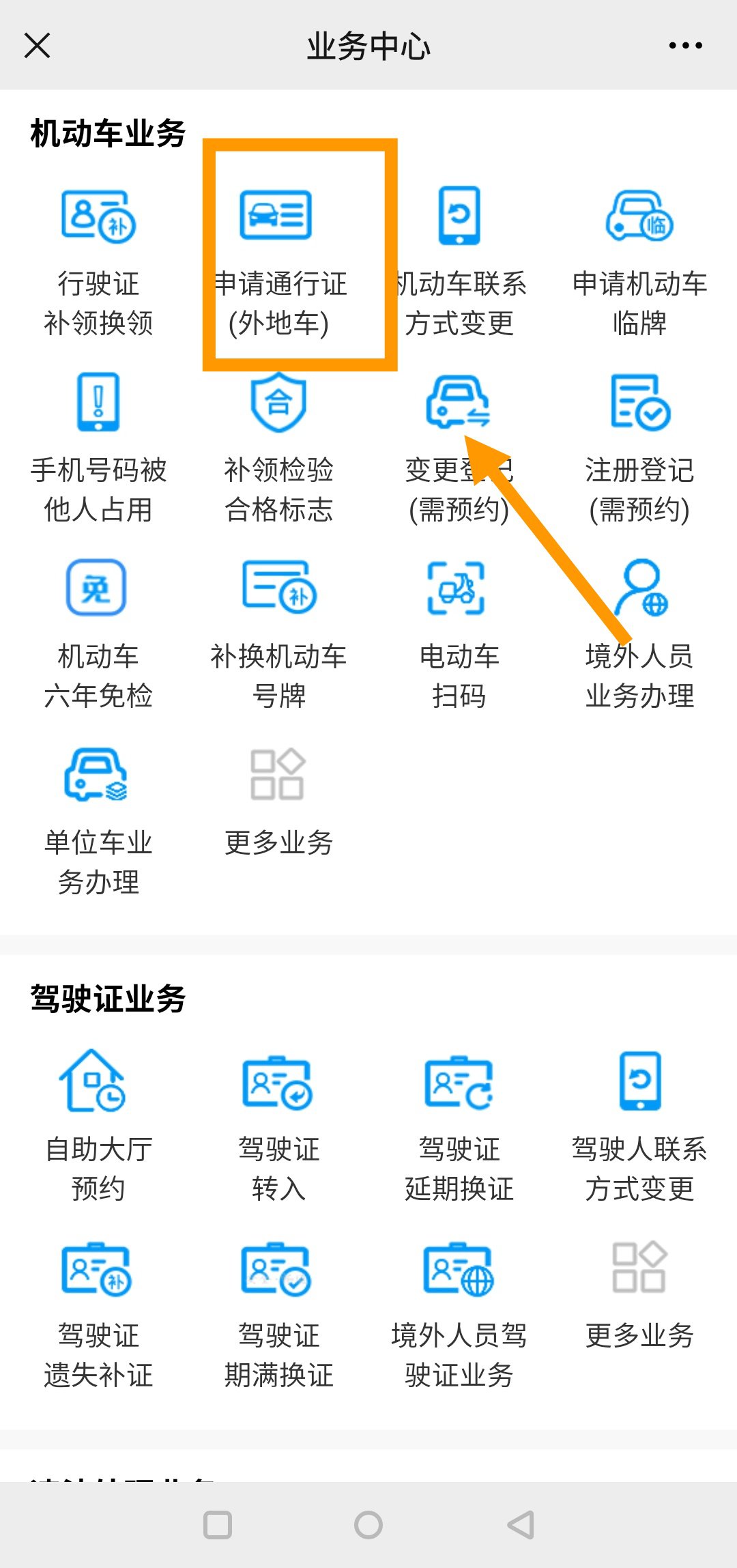4、选择机动车业务中的“申请通行证(外地车)”