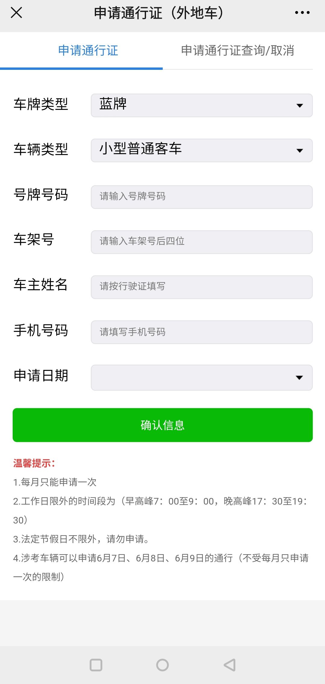 5、输入车主姓名、手机号码、车牌号码等信息,然后点击确认进行申请