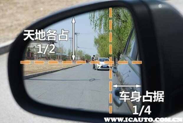 1、左右后视镜的调整方法略有差异,首先调整右后视镜,要确保镜子的最上方能看到后车门把手,同时保证前车门把手在镜子中间,要注意的是车身占倒车镜面积的1/4,原则上越少越好,不过太少的话会导致地面的线与左边镜子看的不一样宽,所以这个要自己去感受。