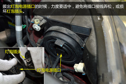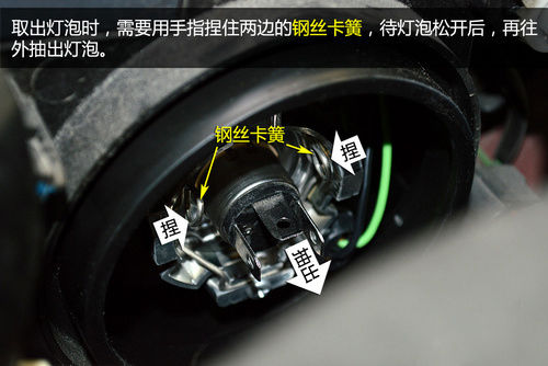 第三步:将灯泡从反射罩中取出。灯泡一般是由钢丝卡簧固定,某些车型的灯泡还带有塑料底座。