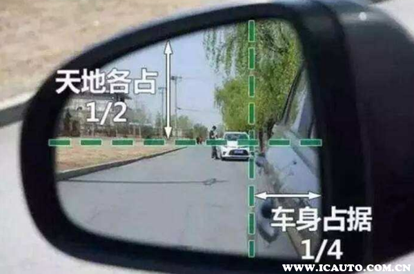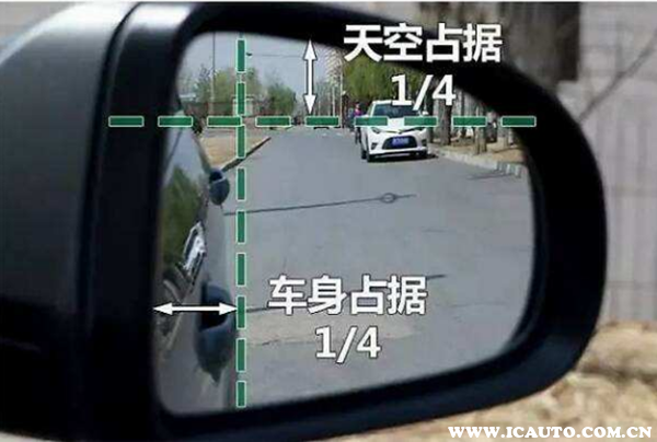 而在调节右侧后视镜时,要确保右后视镜的上下要调节至天空占镜面上半部分约1/4的位置;右后视镜的左右要调节至车身的面积占后视镜面积约1/4,能看到后面拉手。