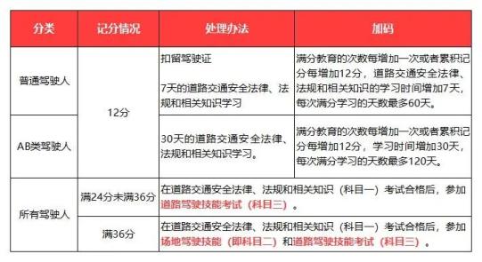 新修订的规定中,记分达到36分及以上的,不仅要参加满分教育学习,还要重考科目一+科目二+科目三。