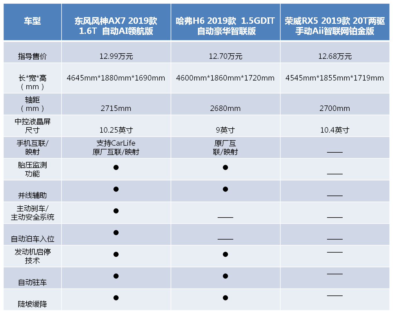 随着国家二胎政策的开放,越来越多的家庭开始将二孩计划提上日程,换车也成了小夫妻们平时讨论最多的话题,一台经济适用的SUV对二胎家庭来说可谓是标配。众多车企也瞄准了这一市场加大投入。这其中,自主品牌12万元级SUV市场竞争尤为激烈,而东风风神全新一代AX7 AI领航型、2019款全新哈弗H6豪华智联版和荣威RX5手动Ali智联网铂金版这三款SUV凭借强大的产品实力和动人的性价比优势,备受消费者的青睐...