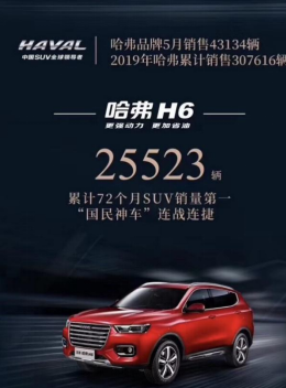近日,长城汽车2019年5月销售数据公布,单月总销量6.2万辆,1-5月总销量达43万辆,在国内车市整体遇冷的环境下,同比逆势增长5.1%。其中作为中流砥柱的哈弗品牌实现月销43134辆,2019年累计销量已超过30万辆,逆势增长8.63%,延续了首季度良好的销量态势,并连续5个月跑赢市场平均增长率。其中,国民神车哈弗H6累计销售25523辆,毫无悬念的实现累计72个月成为SUV销量榜冠军的壮举,...
