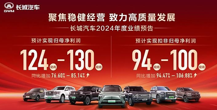 1月14日,长城汽车发布去年年度业绩预告。官方预计去年实现归属于母公司所有者的净利润为124亿元至130亿元。这一数据与去年同期相比增加53.78亿元到59.78亿元,增长76.60%到85.14%。2024年年度实现归属于母公司所有者的扣除非经常性损益的净利润预计为94亿元至100亿元,与上年同期相比预计增加45.66亿元-51.66亿元,同比增加94.47%至106.88%。对于业绩的大幅增长...