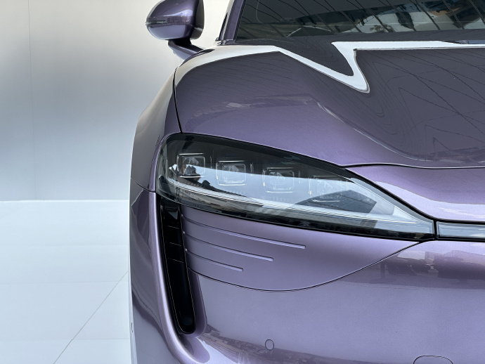 车身侧面,新车线条十分流畅,呈现出轿跑SUV形态,车顶线条平滑向车尾过渡,营造出溜背的视觉感受,加上短前后悬和长轴距的设计,看上去很动感。另外,新车车顶位置设置有瞭望塔式激光雷达,搭配隐藏式门把手、红色的刹车卡钳以及20英寸双五辐式轮圈设计,进一步提升车辆的运动感。车身颜色方面,新车提供经典的陶瓷白、深空灰、鎏金黑、大都会红配色外、幻影紫和晴光蓝共计6种颜色选择。