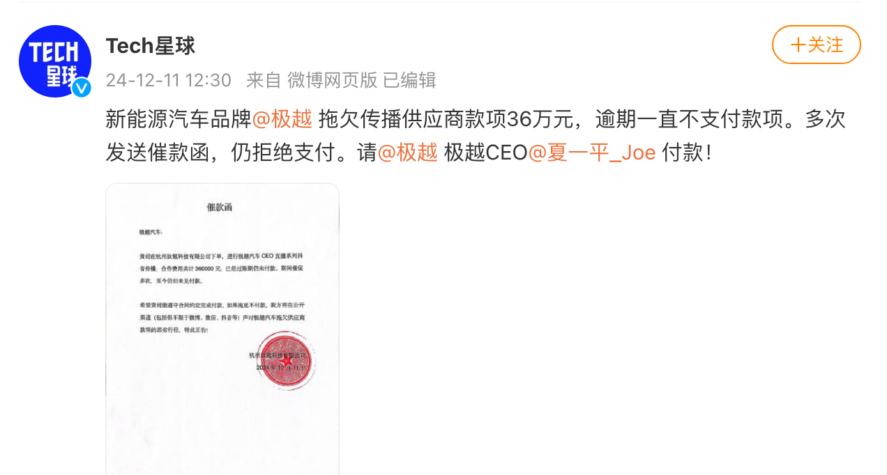 12月11日,微博自媒体@Tech星球发文,传播供应商公开向极越汽车讨债。据催债函显示,新能源汽车品牌极越汽车在杭州肽氪科技有限公司下单,进行极越汽车CEO直播系列抖音传播,合作费用共计360000元,已经过账期仍未付款,期间催促多次,至今仍旧未见付款,希望极越汽车能遵守合同约定完成付款。 截至发稿前,极越汽车暂未回应。简单回顾下极越汽车的发展史,极越汽车的前身是集度汽车,是百度和吉利于...