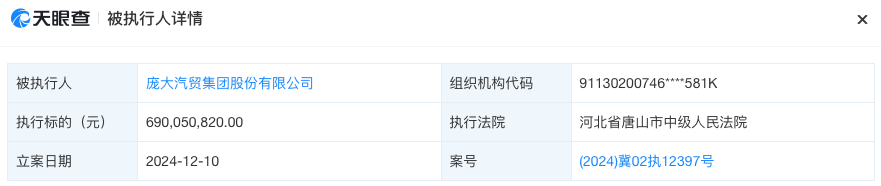 天眼查信息显示,12月10日,庞大汽贸集团股份有限公司(下称“庞大集团”)新增一则被执行人信息,执行标的为6.9亿余元,执行法院为河北省唐山市中级人民法院。这是本月庞大集团第二次被强制执行。12月4日,庞大集团新增两则被执行人信息,执行标的为9.28万元和111.53万元,执行法院为滦州市人民法院。在此之前的11月20日,庞大集团新增多则被执行人信息,高达48则,一口气新增如此多的被执行人信息这在...