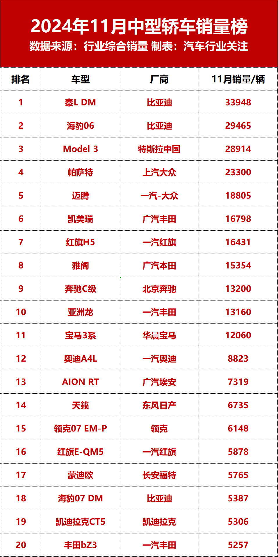 乘联会数据显示,2024年11月国内乘用车市场零售销量为242.4万辆,同比增长16.6%,环比增长7.2%。其中,轿车销量为112.0万辆,同比增长13.3%,环比增长8.4%。从《汽车行业关注》统计的11月中型轿车销量top20榜单来看,11月共有11款车型销量超万辆,分别为秦LDM、海豹06、Model3、帕萨特、迈腾、凯美瑞、红旗H5、雅阁、奔驰C级、亚洲龙、宝马3系。11月中型轿车冠军和...