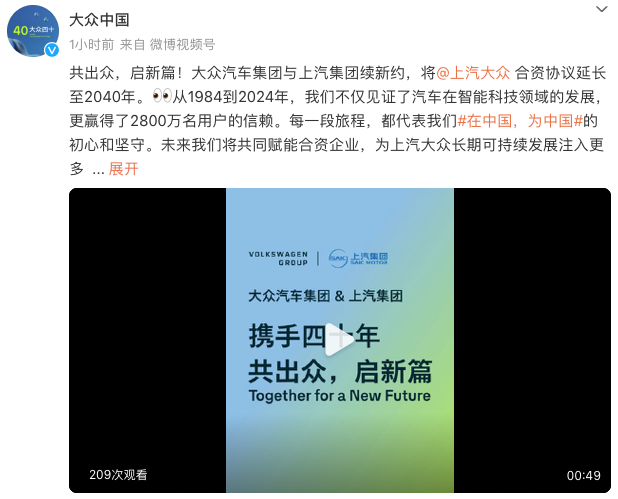 11月27日,上汽集团与大众集团双双官宣,上汽大众合资协议延长至2040年。
