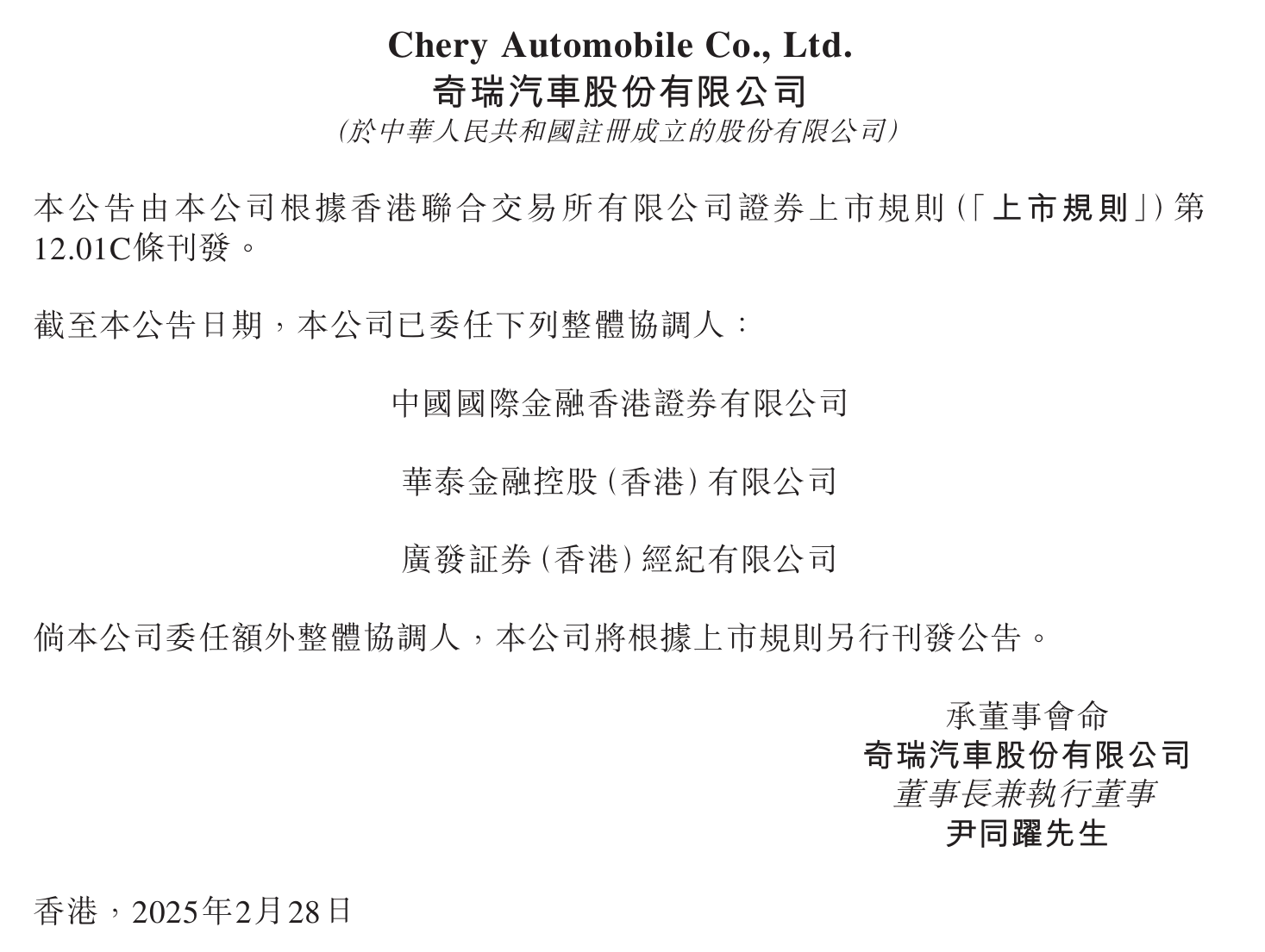 2月28日,港交所文件显示,奇瑞汽车股份有限公司(下称“奇瑞汽车”)向港交所提交上市申请书,中金、华泰及广发为联席保荐人。不过截至发稿前,奇瑞汽车暂未披露募资金额以及上市的更多细节。关于奇瑞汽车IPO最早在2004年就有消息传出,如今20年时间已过去,奇瑞汽车坎坷的上市梦总算要实现了。作为国内为数不多尚未上市的汽车公司,奇瑞IPO的消息在过去一直备受汽车行业关注,在此之前也已多次被传出IPO,但最...