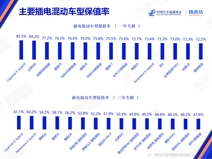 具体车型中,在插电混动榜单中,插电混动车型一年保值率前三名分别为Cayenne E-Hybrid、问界M9、传祺E8新能源;三年保值率前三名车型分别为Cayenne E-Hybrid、Panamera E-Hybrid、理想L8。而在纯电动车榜单中,纯电车型一年保值率前三名分别为问界M9、比亚迪海鸥、Model X;三年保值率前三名车型分别为五菱Air ev晴空、奔奔E-Star、TayCan。