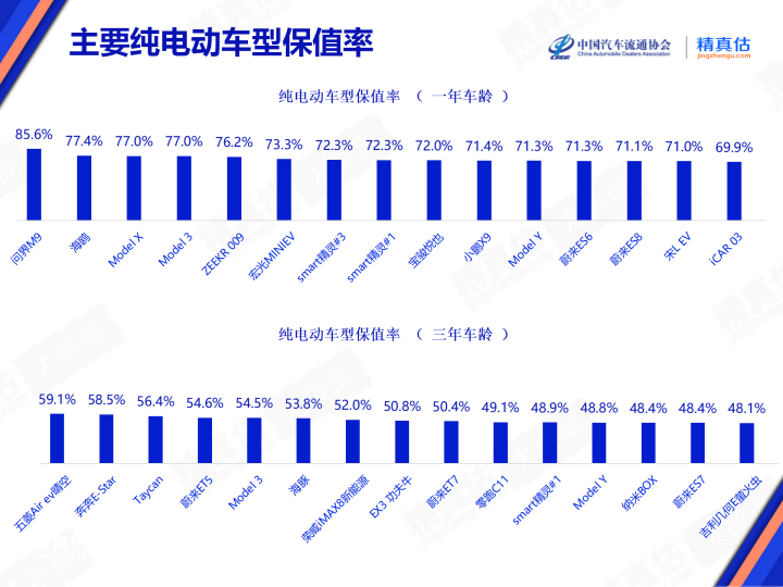 最后再来看看新能源车领域,按动力类型来划分,2月插电混动车型三年车型保值率为47.0%,与1月保持一致;纯电动车型的保值率为45.2%,环比1月的45.3%下滑0.1%。