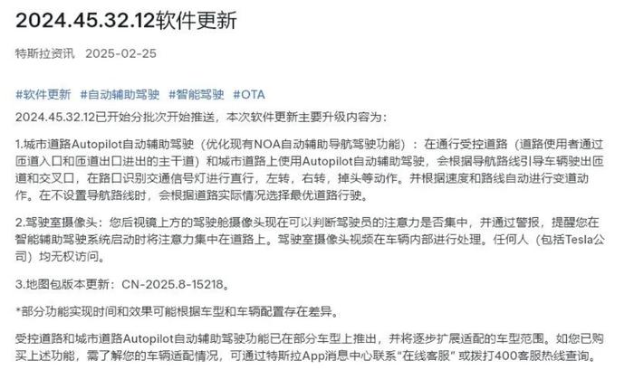 据了解,特斯拉是在今年2月15开始向中国市场的部分车型分批推送FSD软件升级。本次软件升级的内容主要关于城市道路Autopilot自动辅助驾驶功能及驾驶室摄像头。在软件升级后特斯拉车主将可使用城市NOA领航辅助驾驶,系统将具备识别交通信号灯、自主变道、识别交叉路口等功能。