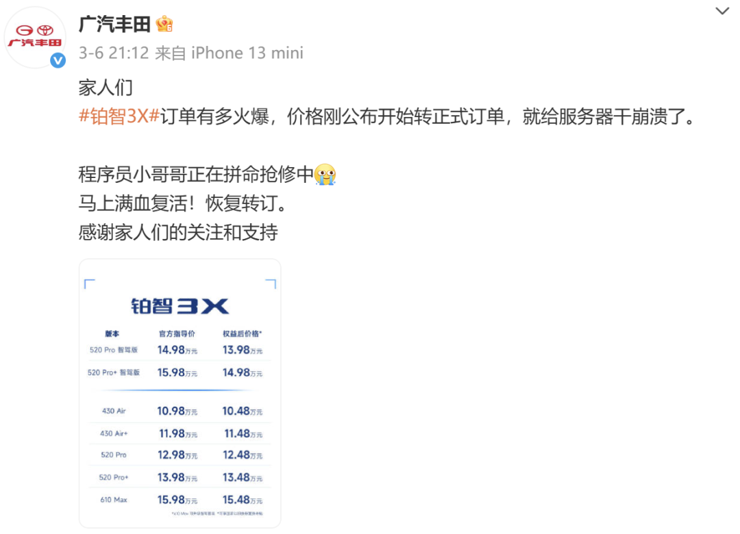 此前,在新车上市之际,广汽丰田曾在微博发文表示:“新车订单有多火爆,价格刚公布开始转正式订单,就给服务器干崩溃了。程序员小哥哥正在拼命抢修中,马上满血复活!恢复转订。”据官方数据,新车上市一个小时内订单破万辆,至今大定订单突破1.5万辆,但自上市以来累计销量为2500辆。