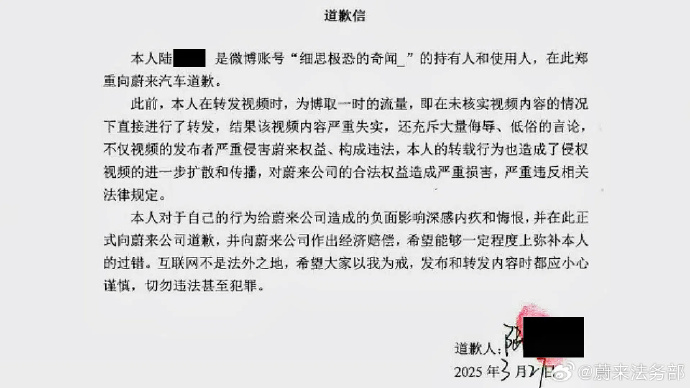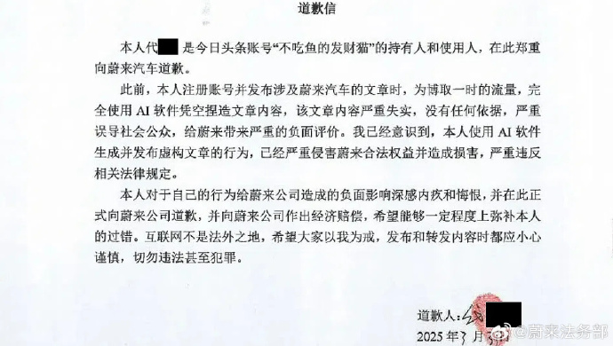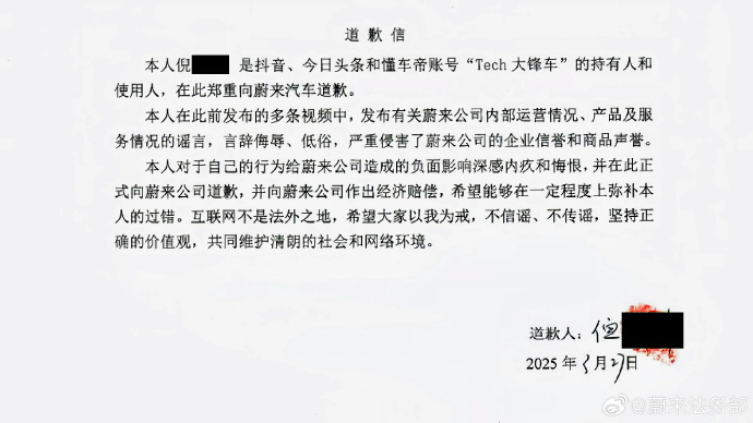 据道歉信内容显示,侵权网络账号“Tech大锋车”持有人倪某此前在发布的多条视频中,发布关于蔚来公司内部运营情况、产品以及服务情况的谣言,言辞侮辱、低俗,严重侵害了蔚来公司的企业信誉和商品声誉。微博账号“细思极恐的奇闻_”持有人陆某此前在转发视频时,为博取一时流量,在未核实视频内容真实情况直接进行了转发,视频内容严重失实、还充斥大量侮辱、低俗的言论,转发行为造成了侵权视频进一步扩散和传播,对蔚来公司的合法权益造成严重损害。今日头条账号“不吃鱼的发财猫”持有人代某此前注册账号并发布涉及蔚来汽车的文章时,为博取一时流量,完全使用AI软件凭空捏造文章内容,该文章内容严重失实,没有任何依据,严重误导社交公众,给蔚来带来严重的负面评价。