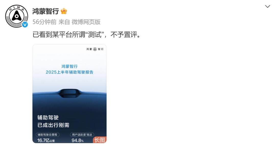 鸿蒙智行则对懂车帝的测试结果评论表示:已看到某平台所谓“测试”,不予置评。广汽丰田销售副总的@广汽丰田彭宝林回应:安全优先、生命至上,再好的智驾都是辅助驾驶。