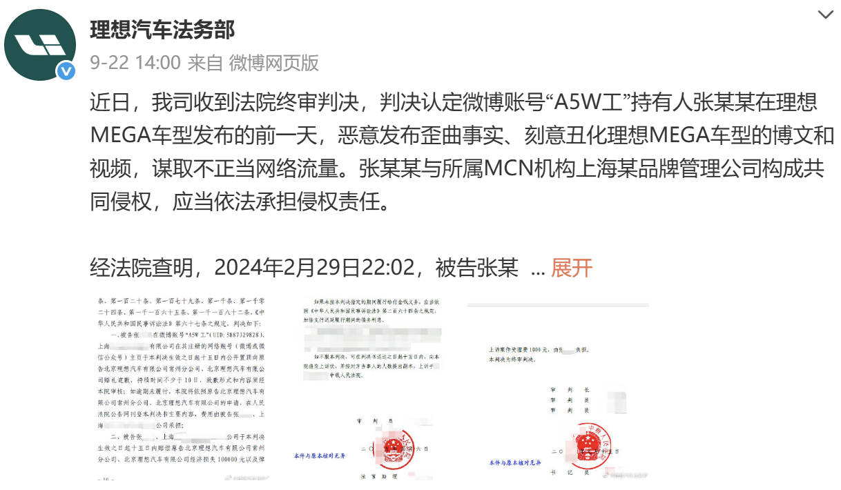 自9月22日以来,理想汽车法务部已连续发布三条微博。9月22日,理想汽车法务部表示,收到法院终审判决,判决认定微博账号“A5W工”持有人张某某在理想MEGA车型发布的前一天,恶意发布歪曲事实、刻意丑化理想MEGA车型的博文和视频,谋取不正当网络流量。法院最终判决:张某某及其签约MCN机构在其网络账号置顶公开赔礼道歉,并支付12万元损失及维权费用。