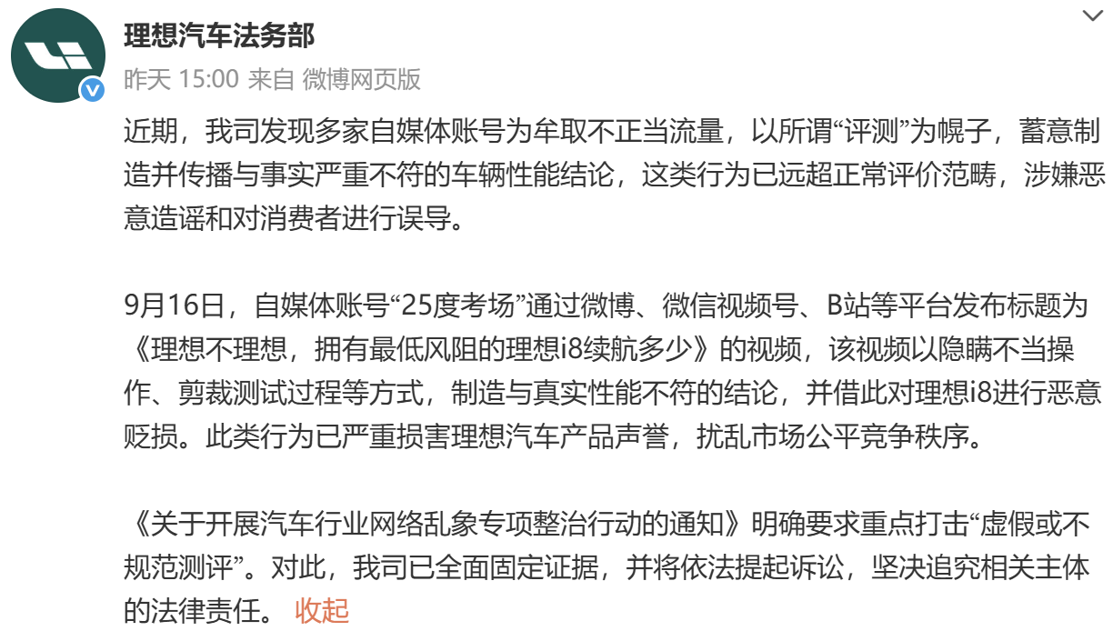 9月23日,理想汽车法务部称,理想汽车法务部指出,9月16日,自媒体账号“25度考场”通过微博、微信视频号、B站等平台发布标题为《理想不理想,拥有最低风阻的理想i8续航多少》的视频,该视频以隐瞒不当操作、剪裁测试过程等方式,制造与真实性能不符的结论,并借此对理想i8进行恶意贬损。理想汽车法务部表示,此类行为已严重损害理想汽车产品声誉,扰乱市场公平竞争秩序。理想汽车法务部已全面固定证据,并将依法提起诉讼,坚决追究相关主体的法律责任。
