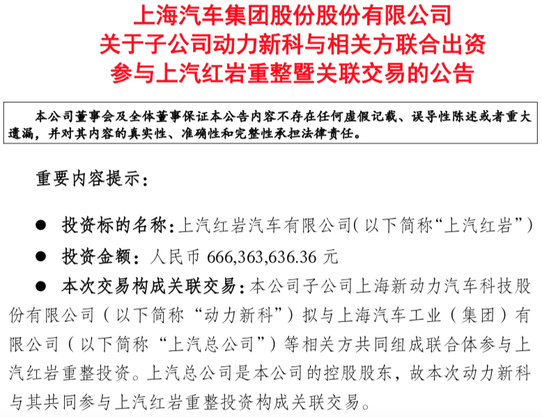 10月1日,上汽集团发布《关于子公司动力新科与相关方联合出资参与上汽红岩重整暨关联交易的公告》。公告内容显示,子公司动力新科拟与上汽总公司等相关方共同组成联合体参与上汽红岩重整投资,投资金额为6.66亿元,预计取得重整后上汽红岩14.66%目标股权。此外,动力新科也发布公告称,公司拟与上汽总公司、重庆两江新区高质量发展产业私募股权投资基金合伙企业(有限合伙)、重庆发展资产经营有限公司共同组成联合体...