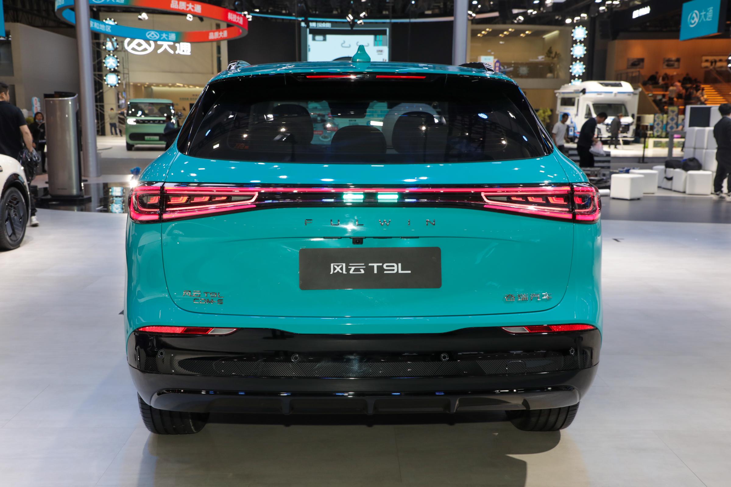 车身侧面,新车线条流畅,呈现出轿跑SUV的设计感,采用半隐藏式门把手以及无边框式外后视镜,前后侧翼子板搭配宽厚的黑色轮眉,营造出较强的运动感。尺寸方面,新车长宽高分别为4870/1930/1710mm,轴距为2920mm,定位中型SUV。车尾部分,新车整体造型简洁大方,尾灯组采用贯穿式设计,两侧主尾灯组呈现环绕和点阵设计,夜间点亮后同样拥有非常高的辨识度。尾灯组下方标有“FULWIN”英文标识,尾门左下角带有“风云T9L CDM”,右侧则带有“奇瑞汽车”表明车辆身份信息。后包围造型比较简单,采用与车身不同色的设计,搭配车顶配备的扰流板,强化运动属性。