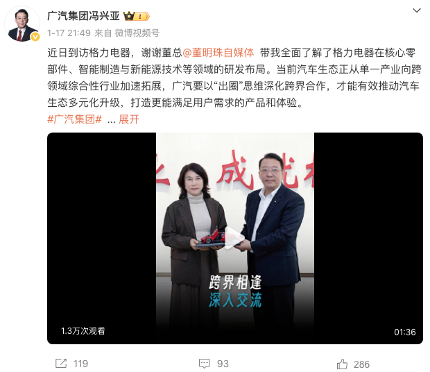 事情是这样的,1月15日,广汽集团董事长冯兴亚率队访问格力电器,与格力董事长董明珠及管理团队共商“人车家”智慧生态融合发展,探讨产业协同。冯兴亚在邀请董明珠体验昊铂A800时表示,广汽集团为其高端品牌昊铂专门做了一款攀登版,该车搭载1004颗芯片,且知识产权均属于中国。董明珠听闻笑称:“将来有500个是我的”,随后,冯兴亚表示:“下一步争取把你的车芯片都装到这车上来”。而这被部分内容也被媒体解读为明确合作承诺并广泛传播。此后,冯兴亚还在微博发布:“近日到访格力电器,谢谢董总@董明珠自媒体带我全面了解了格力电器在核心零部件、智能制造与新能源技术等领域的研发布局。当前汽车生态正从单一产业向跨领域综合性行业加速拓展,广汽要以‘出圈’思维深化跨界合作,才能有效推动汽车生态多元化升级,打造更能满足用户需求的产品和体验。”