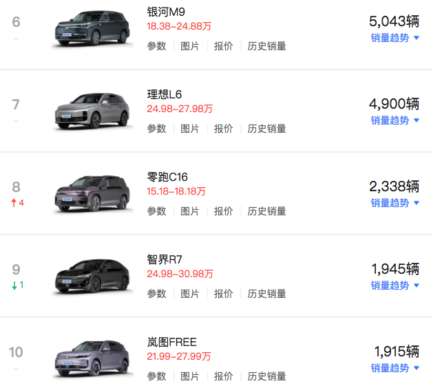 2月宝马X5以5283辆的销量排名榜单第五名,1至2月累计销量为13135辆。银河M9、理想L6、零跑C16、智界R7、岚图FREE销量分别为5043辆、4900辆、2338辆、1945辆、1915辆,1至2月累计销量为11635辆、9925辆、4748辆、5766辆、5480辆。其中,银河M9在银河品牌中定位旗舰车型,于2025年9月上市,目前售价为18.38-24.88万元,动力上搭载1.5T四缸涡轮增压发动机+3电动机组成的插电式混动系统,在车市中与长安深蓝S09、乐道L90、昊铂HL等车型竞争。