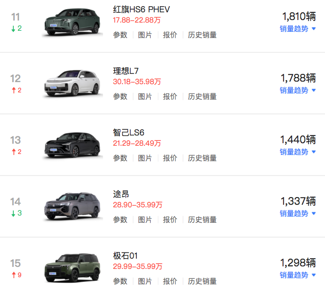 除上述车型之外,包括红旗HS6 PHEV、理想L7、智己LS6、途昂、极石01均进入榜单前十五名,2月销量分别为1810辆、1788辆、1440辆、1337辆、1298辆,1至2月累计销量为5577辆、3901辆、3530辆、3901辆、2326辆。