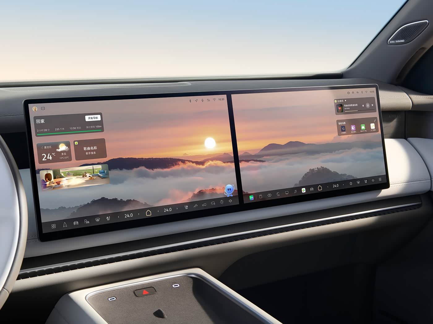 上汽大众ID.ERA 9X装配了双辐式多功能方向盘,连辐处为机械按键和旋钮。副仪表台处布置有双闪按键以及两个USB Type-C接口,副仪表台处还集成有手机无线充电功能。后排配备有一块21.4英寸的吸顶屏,车顶采用分段式天窗设计,顶篷两侧以及门内饰板处还配有氛围灯。