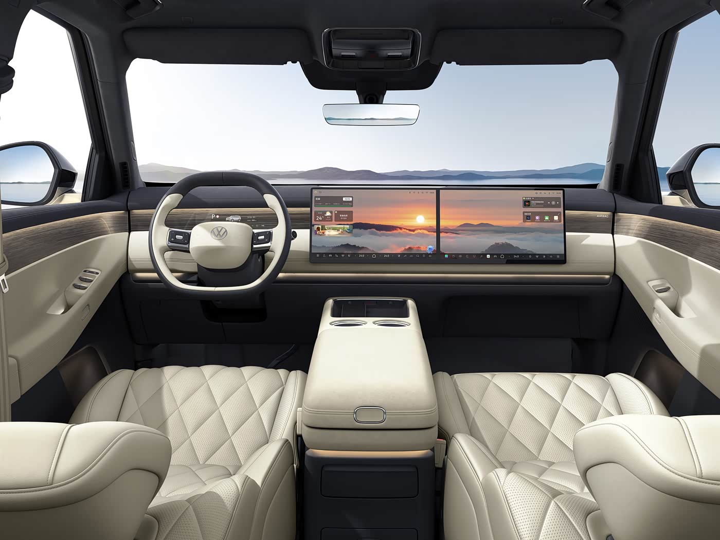 内饰方面,上汽大众ID. ERA 9X车内采用相对简洁的设计语言,中控台上几乎未保留任何物理按键,中控台配备双15.6英寸中控屏和副驾屏,屏幕底部固定有空调、座椅通风加热、影音娱乐等功能的快捷操作栏。此外,新车并未配备常规的液晶仪表,而是将仪表显示功能融入到中控台的木纹饰板内。