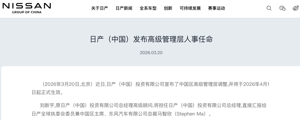 3月20日,日产(中国)投资有限公司宣布中国区高级管理层调整。日产(中国)表示,原日产(中国)投资有限公司总经理高级顾问刘新宇,将担任日产(中国)投资有限公司总经理,直接汇报给日产全球执委会委员兼中国区主席、东风汽车有限公司总裁马智欣(StephenMa),该任命自2026年4月1日起正式生效。这项任命生效后,刘新宇将成为日产中国首位中国籍总经理,而在此之前的总经理均为外籍。而原日产(中国)投资有...