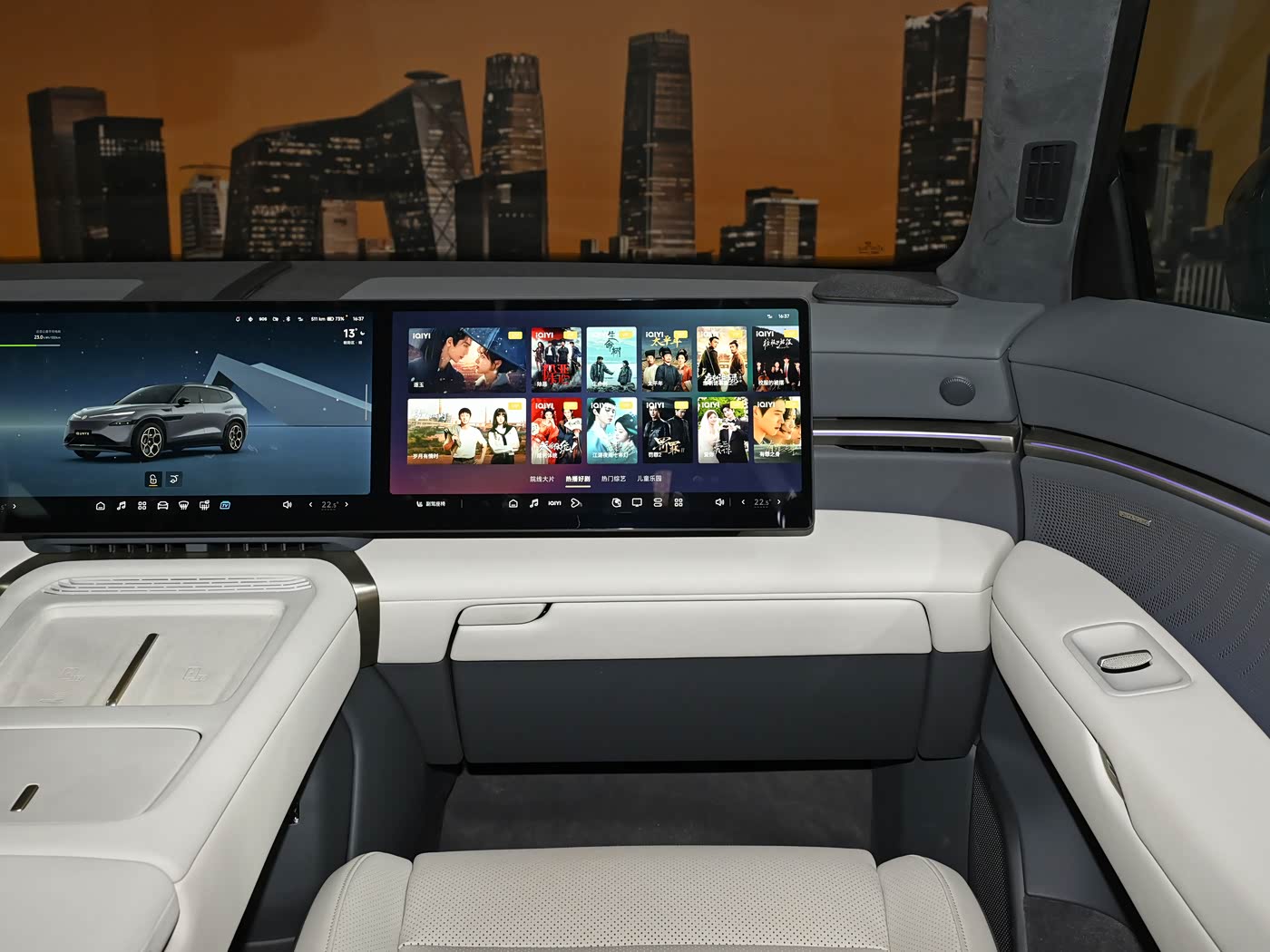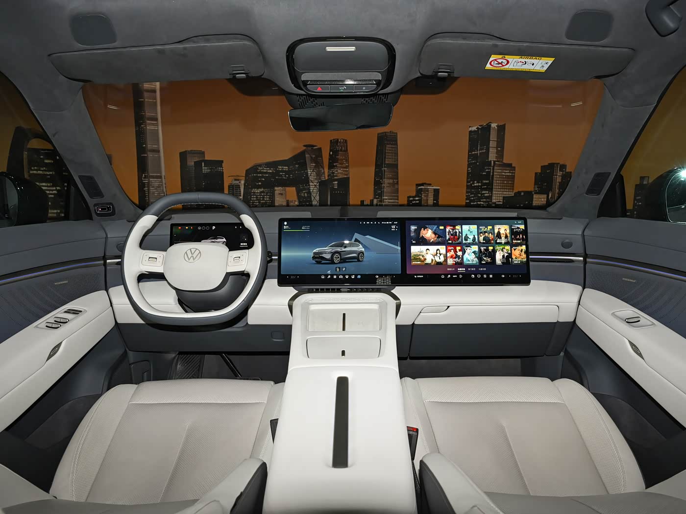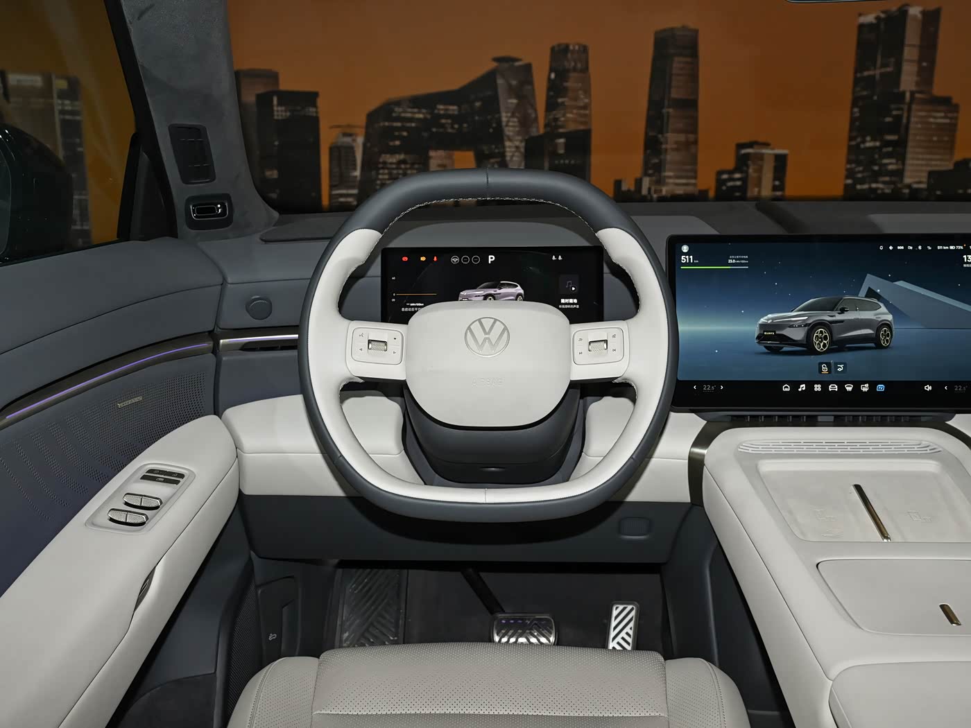 内饰方面,与众08内饰整体采用较为居家的设计风格,环抱式座舱搭配10.25英寸高清液晶仪表+双14.96英寸双联屏,让其符合当下新能源车型的主流配置以及审美。双辐多功能方向盘回归实体按键与滚轮设计,中央处具有金色可发光大众车标。整车座椅采用Nappa真皮,副驾座椅提供14向电动调节配合腿托。同时,车辆还将提供10点气动按摩、柔光化妆镜。车辆二排提供折叠桌板、主/副驾座椅靠背磁吸接口、靠背10°可调,提供座椅加热、隐私玻璃、中央扶手杯托。此外,车顶提供1.74㎡智能调光天幕,搭载20扬声器音响系统,支持7.1.4声道。