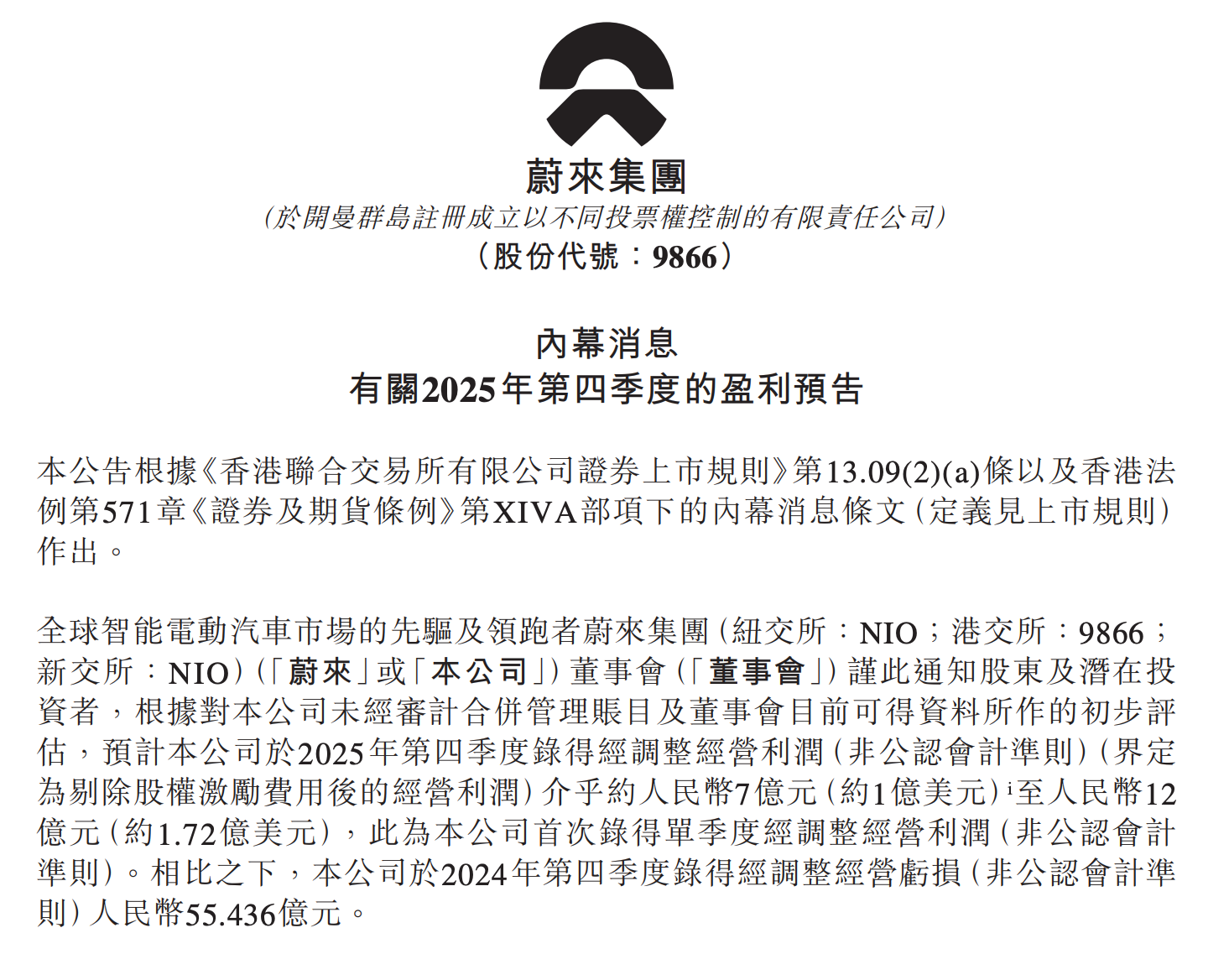2月5日,蔚来发布2025年第四季度盈利预告,预计2025年第四季度录得经调整经营利润(非公认会计准则)(界定为剔除股权激励费用后的经营利润)介于人民币7亿元(约1亿美元)至人民币12亿元(约1.72亿美元)。对于2025年预计实现盈利的原因,蔚来方面解释称,这主要归因于公司在2025年第四季度销量持续增长、有利的产品组合推动汽车毛利率优化以及公司持续推行全面降本增效措施。作为对比,蔚来在2024...