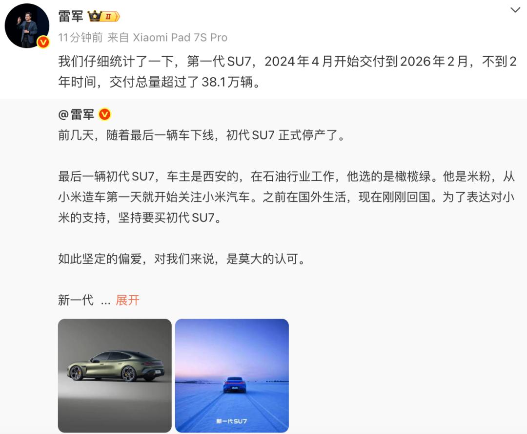 2月10日,小米创始人雷军在直播中曾透露,最后一辆初代小米SU7量产下线,正在运送途中,将安排车主提车。该消息,也意味着小米SU7即将正式停产。2月11日,雷军本人确认了这一消息,其发文称随着最后一辆车下线,初代SU7正式停产了。此外,雷军还透露第一代SU7从2024年4月开始交付到2026年2月,不到2年时间,交付总量超过了38.1万辆。