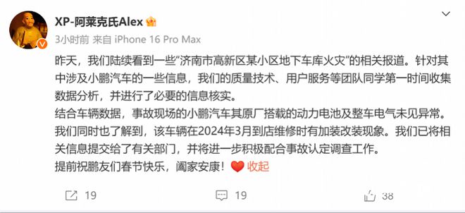 今日,小鹏汽车公关负责人@XP-阿莱克氏Alex在微博发文,针对近期山东济南市某小区车库内一辆小鹏汽车起火烧毁地库十几辆车一事进行回应。其表示在事故发生后官方的质量技术、用户服务等团队同学第一时间收集数据分析,并进行了必要的信息核实。结合车辆数据,事故现场的小鹏汽车其原厂搭载的动力电池及整车电气未见异常。与此同时还透露,起火的小鹏车辆在去年3月到店维修时有加装改装现象。目前已将相关信息提交给了有关...