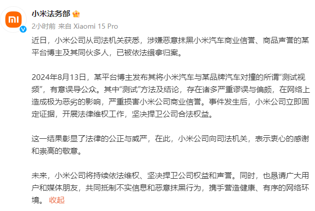 今日,小米法务部官方微博发文称,此前涉嫌恶意抹黑小米汽车商业信誉、商品声誉的某平台博主及其同伙多人,已被依法缉拿归案。官方指出在去年8月13日,某平台博主发布小米汽车与某品牌汽车对撞的所谓“测试视频”,有意误导公众。其中“测试”方法及结论,存在诸多严重谬误与偏颇,在网络上造成极为恶劣的影响,严重损害小米公司商业信誉。事件发生后,小米公司立即开展法律维权工作,坚决捍卫公司合法权益。未来将持续依法维权...