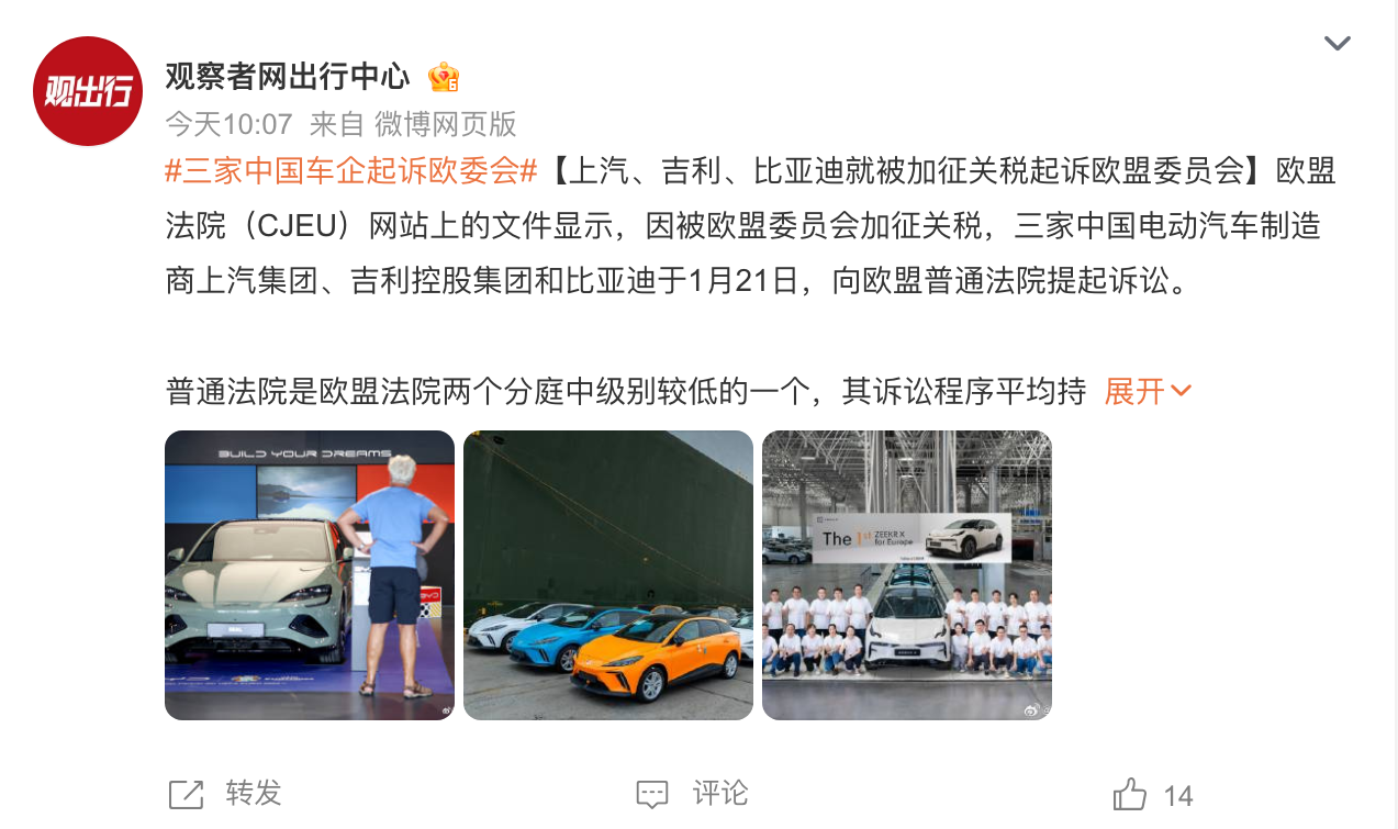 据欧盟法院(CJEU)网上文件显示,因被欧盟委员会加征关税,三家中国汽车制造商上汽集团、吉利控股集团和比亚迪于最后期限前一天的1月21日向欧盟普通法院提起诉讼。普通法院是欧盟法院两个分庭中级别较低的一个,其诉讼程序平均持续18个月,且可以上诉。不过,欧盟法院并没有提供案件的进一步细节。此外,中国机电产品进出口商会(CCCME)也于1月22日向欧盟法院提出申诉。这些法律行动标志着中国车企和行业机构对...